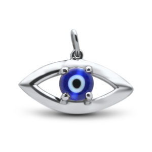 The pendant showcases a gorgeous eye surrounded with shiny sterling silver with a blue gem in the center. A unique design.  A beautiful jewellery pendant will make a wonderful gift. The eye is a symbol to protect against misfortune and injury. Designed by Tina. Earrings available.