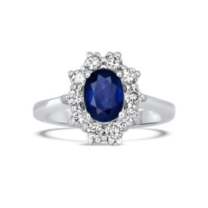This elegant engagement ring features brilliant cut cubic zirconia that surround the centre oval sapphire. Finished with a high polished finish, to give it that outstanding look. Available in any gems.
