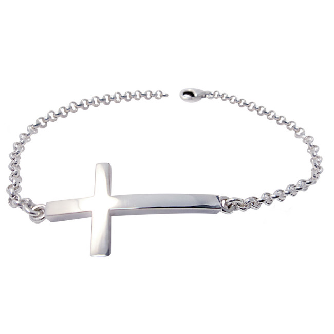 This side way white gold Cross bracelet is so high polished that it will shiny from any angel. Pair it up with any other bracelets you have. Available in yellow gold upon request!