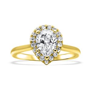 This lovely halo engagement ring feature one rows of pave set diamonds that surround the pear shape centre diamond.