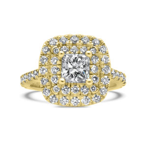 Capture the essence of your eternal love with this elegant pave set diamond ring! This engagement ring features a double halo framing the centre diamond, incorporating round brilliant cut diamonds. A timeless statement that truly defines brilliance. A stunning piece of art.