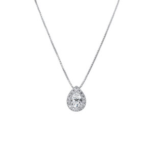 This remarkable diamond pendant feature a pear – shape diamond in the centre within a halo of diamonds. Sparkling endlessly with every move. Available in yellow gold upon request.