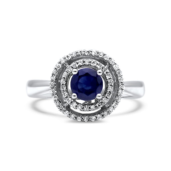 You will definitely fall in love with this double-halo style diamond ring! Features a royal blue sapphire in the centre, framed with shimmering diamonds.