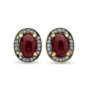 Sometimes simplicity is best, these beautiful oval ruby diamond earrings, adding a touch of sparkle set in shiny yellow gold. The cabochon bright red ruby showcases the centre followed by a diamond halo.