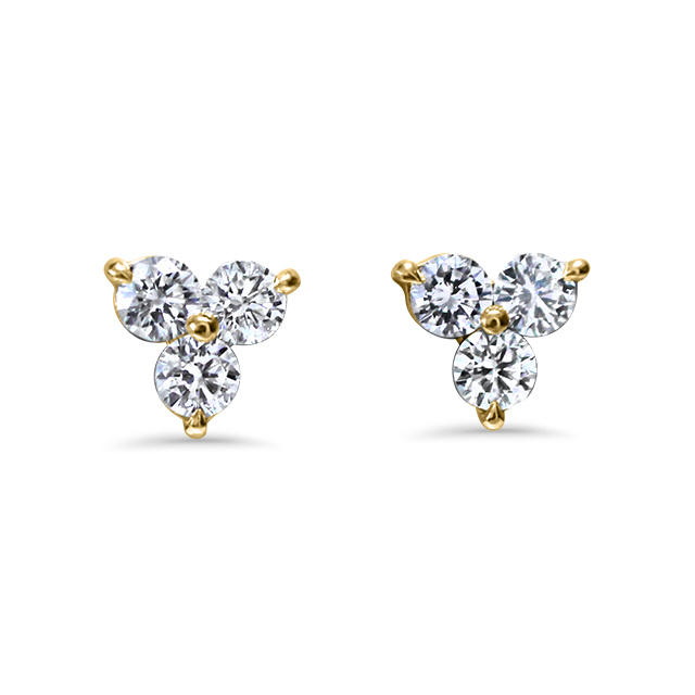 Three diamonds stud earrings, a timeless elegance with beauty in mind. Cradled in claw set with a post backing. Available in Pendant & in yellow gold!