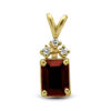 A bold emerald cut garnet earrings, framed in a prong setting followed by three accent brilliant cut diamonds. Simplicity and elegant design. Matching pendant available.