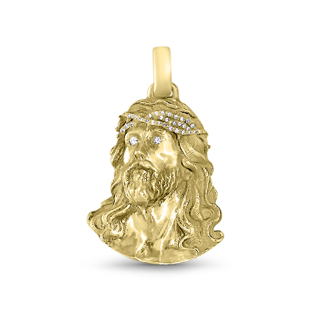 This glamorous Jesus face pendants, is crafted in solid yellow gold. Followed by pave’ set cubic zircons, with a large bale to fit your chain. Custom-made with diamonds is available upon request!