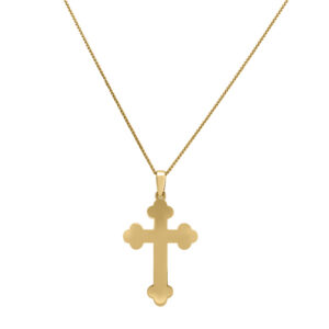 Orthodox cross followed with a high polished finish. Faithfully handcrafted in solid yellow gold. Available in white gold!