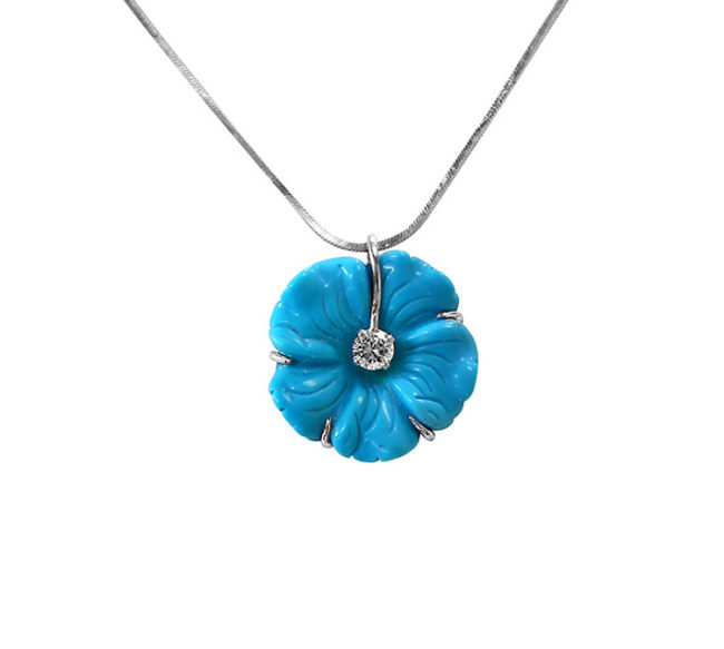 This lavish hand carved sky blue Turquoise Diamond Pendant is designed by Tina. The pendant features a brilliant cut diamond in a four claw setting in the center of the flower. This one of a kind design is truly a statement piece.