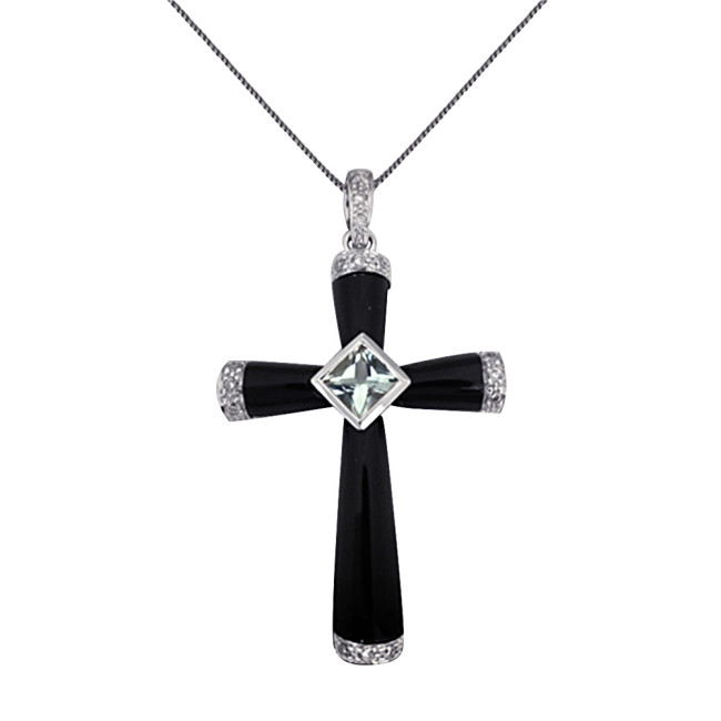 This Custom Made Onyx and Diamond Cross Features a princess cut Aquamarine in the centre of the cross to add extra shine to this brilliant design. The bale and the sides of the cross features round brilliant diamonds to add sparkle and shine. Cross measures 1.5 “