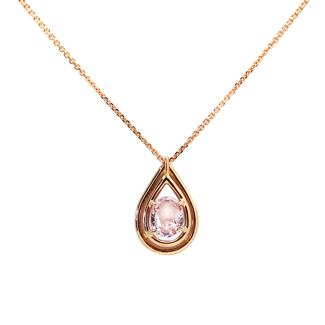 The oval peach morganite set in four claw setting creates beautiful harmony with it’s rose gold frame. This hand crafted pendant is carefully designed by Tina. It showcases an orange-pink morganite gem;a beautiful gem that goes fine with rose gold.