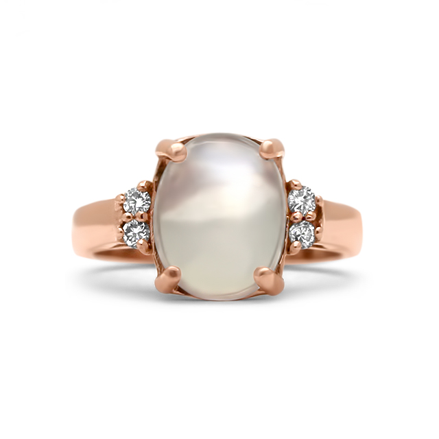 Our best-selling yellow gold oval cabochon moonstone set in four claw, followed by brilliant cut diamonds. Versatile and elegant ring for casual days or special day out. Available in rose gold.