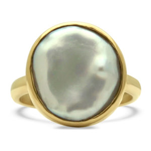 This Japanese keshi pearl ring is beautifully set in a solid gold bezel frame. Keshi pearls are also known as poppy seed, grown from freshwater or saltwater. Each pearl has it own unique shape.