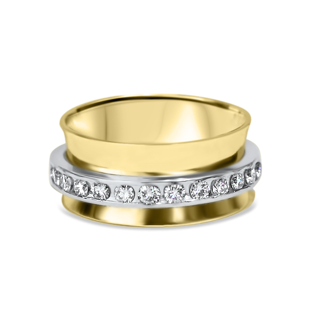This meditation ring is crafted in two-tone gold and adored with delicate diamonds, symbolizing clarity and inner light. The spinning band serves as a reminder to breath, pause and relax. Made to order!