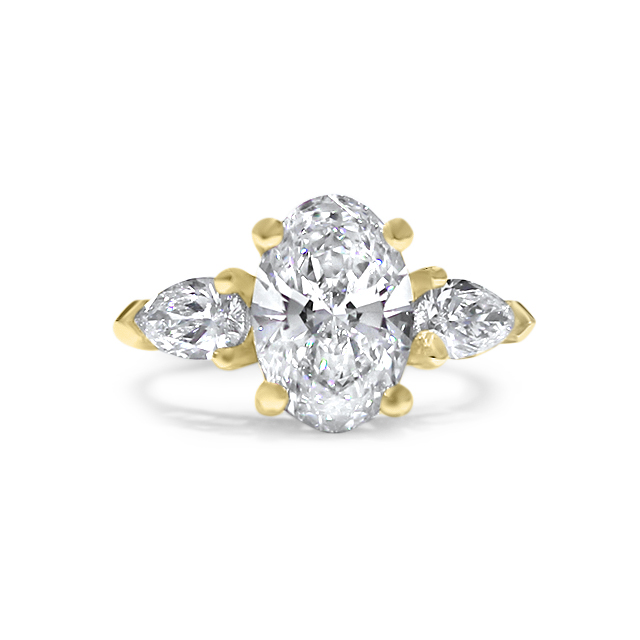 Classic three stone lab diamond engagement ring in white gold setting. Beautifully showcasing the brilliant cut centre diamond, set with two pear shape side diamonds. Brilliantly represent past, present & future! Available in yellow gold upon request!